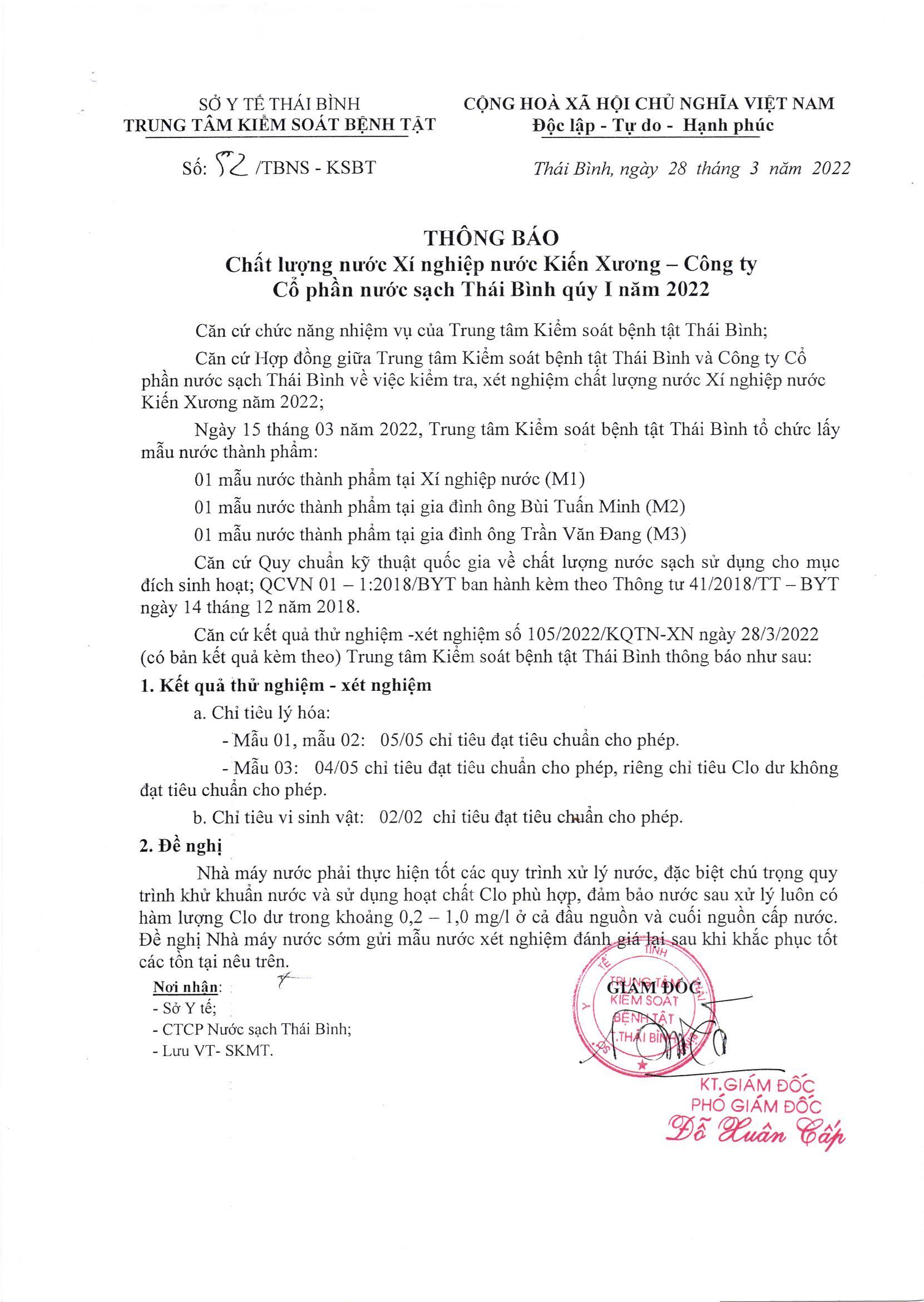 4. Xí nghiệp nước Kiến XươngKết quả kiểm nghiệm chất lượng nước XNN Kiến Xương Quý I/2022 Posted on 13 Tháng Tư, 2022 by admin Kết quả kiểm nghiệm chất lượng nước Xí nghiệp nước Kiến Xương – Công ty Cổ phần nước sạch Thái Bình Quý I/2022 Kết quả kiểm nghiệm chất lượng nước XNN Vũ Thư Quý I/2022 Kết quả kiểm nghiệm chất lượng nước XNN Hưng Hà Quý I/2022
