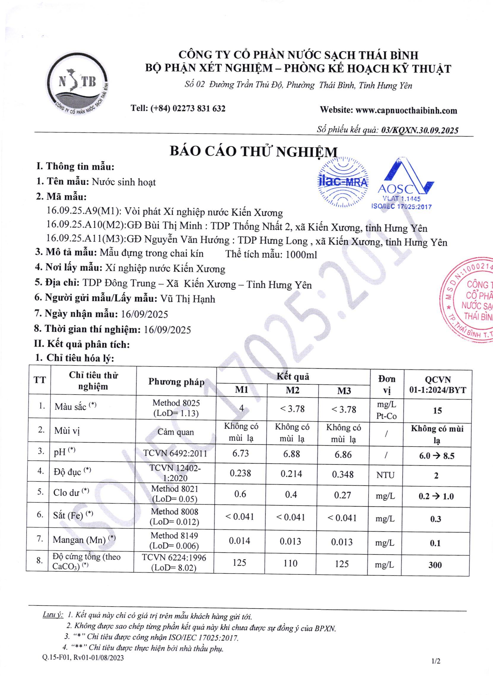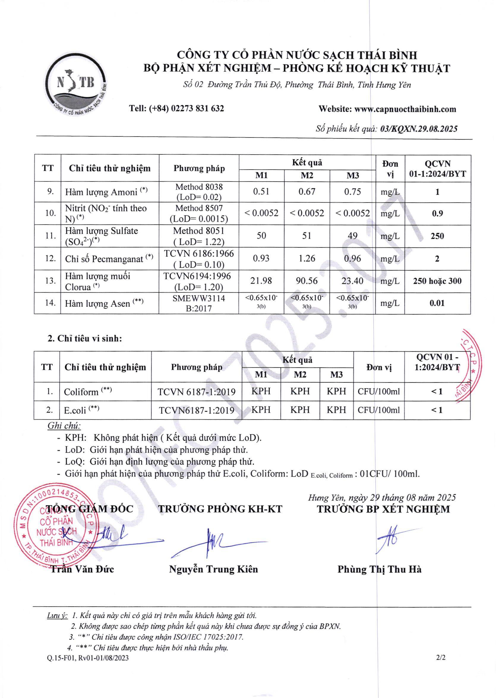 CHẤT LƯỢNG NƯỚC, 4. Xí nghiệp nước Kiến XươngKết quả kiểm nghiệm chất lượng nước XNN Kiến Xương Quý III-2025 Posted on 6 Tháng Tám, 202510 Tháng Mười, 2025 by admin Kết quả kiểm nghiệm chất lượng nước XNN Vũ Thư Quý III-2025 Kết quả kiểm nghiệm chất lượng nước XNN Hưng Hà Quý III-2025