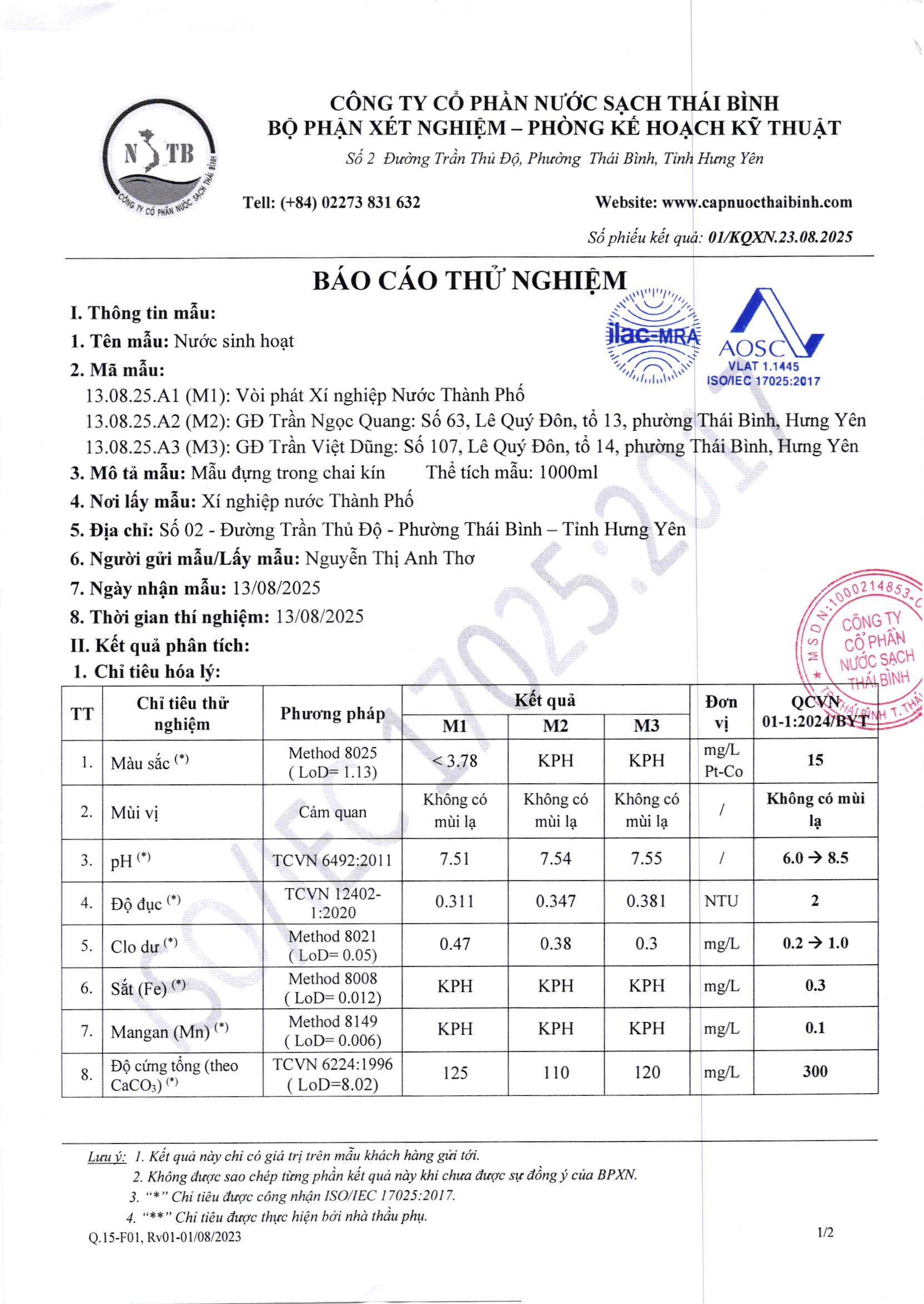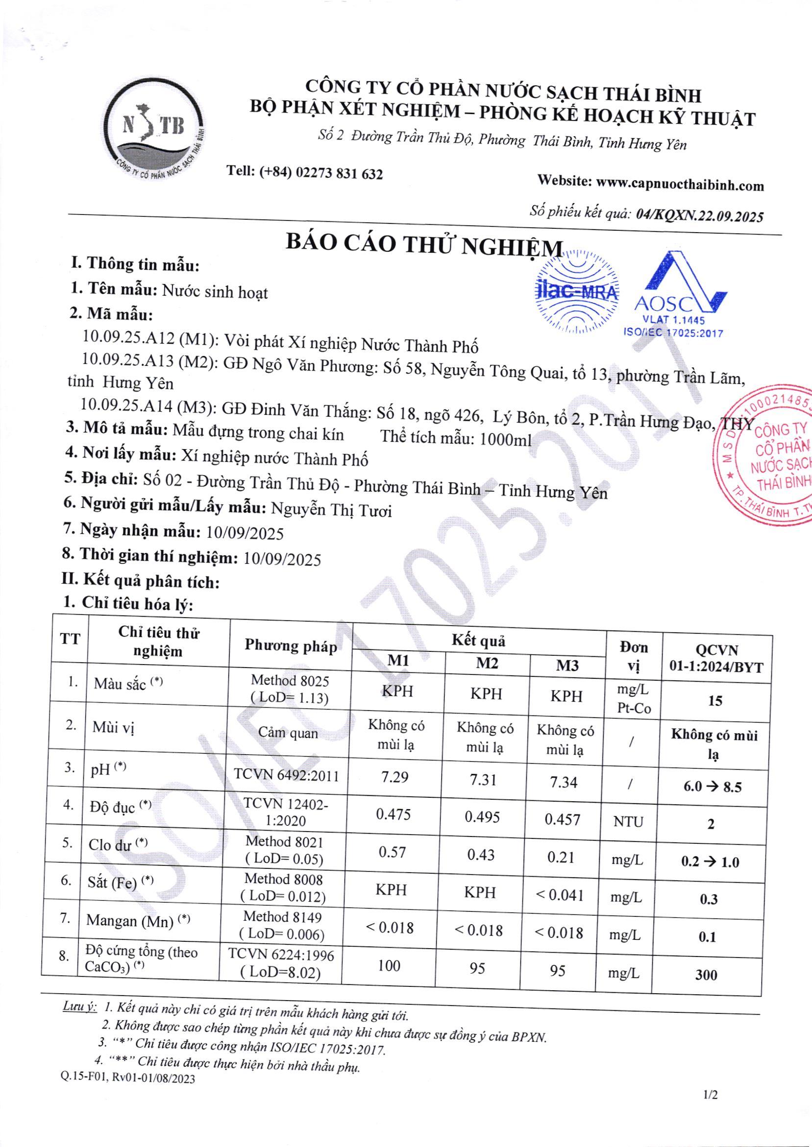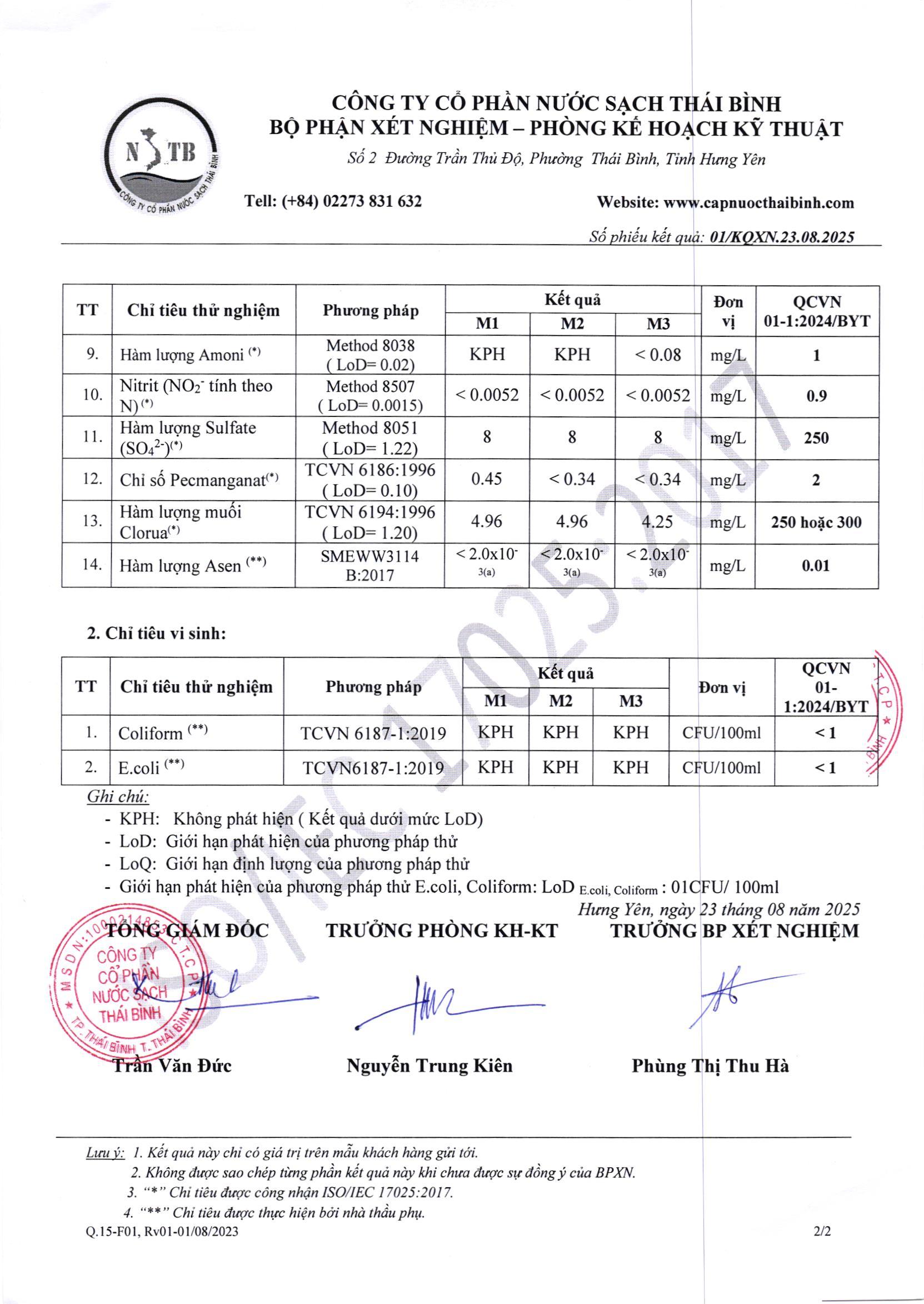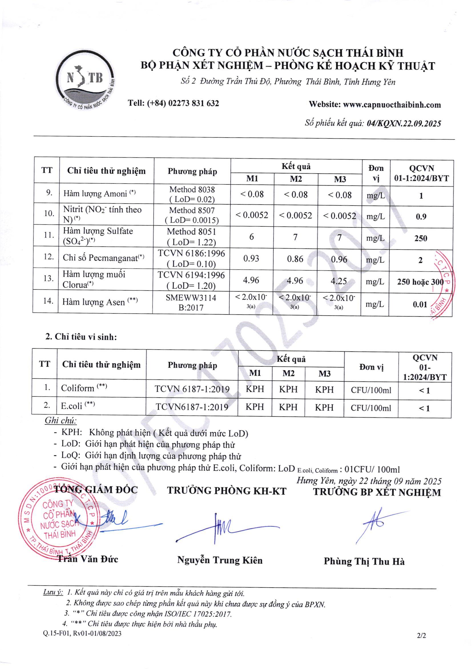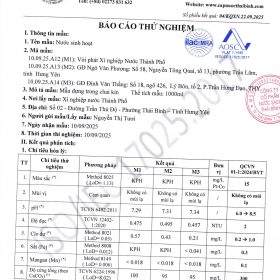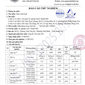 CHẤT LƯỢNG NƯỚC, 1. Xí nghiệp nước Thành PhốKết quả kiểm nghiệm chất lượng nước XNN Thành Phố Quý III-2025 Posted on 6 Tháng Tám, 202510 Tháng Mười, 2025 by admin Báo cáo tình hình quản trị 6 tháng năm 2025 Kết quả kiểm nghiệm chất lượng nước XNN Tiền Hải Quý III-2025