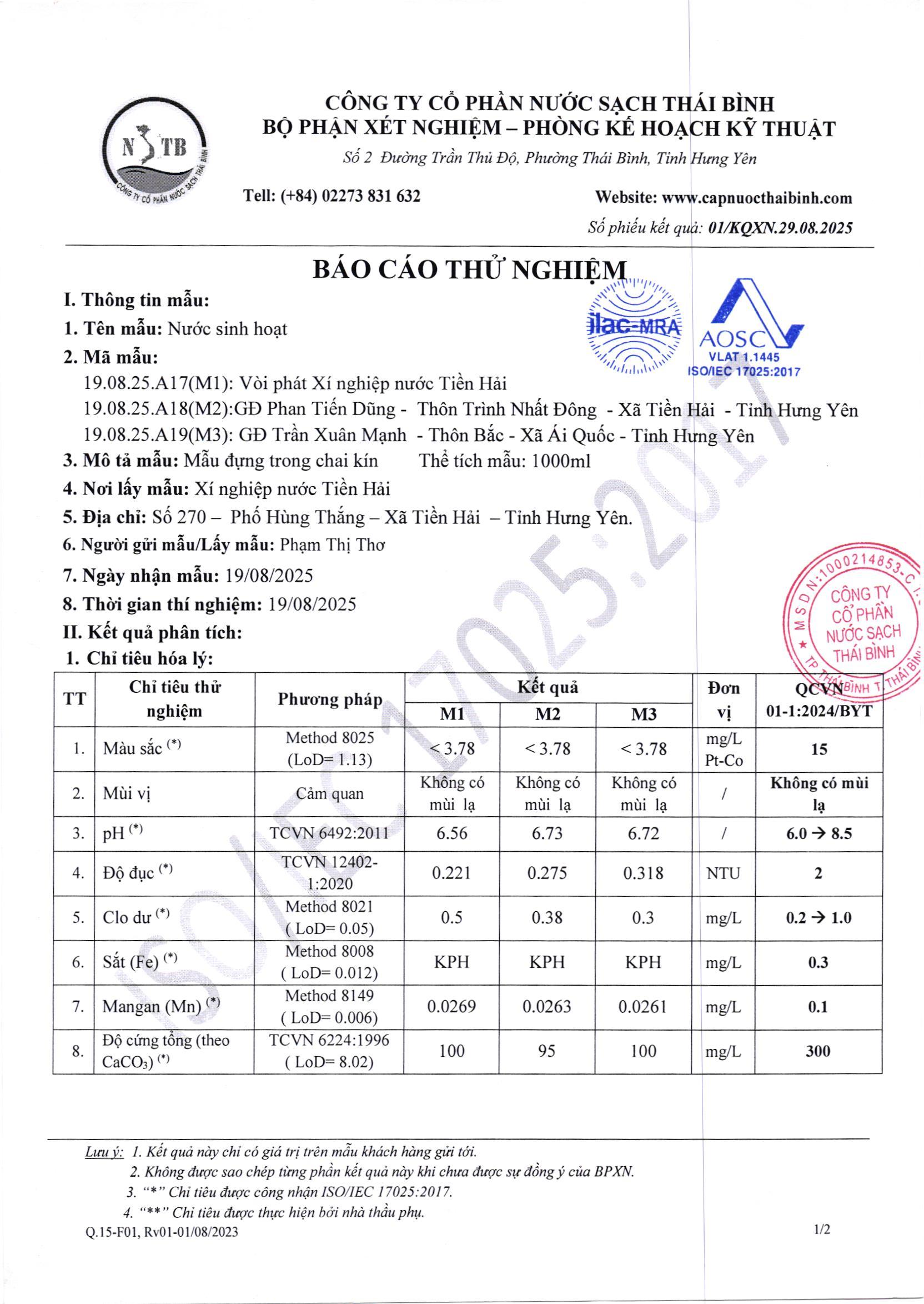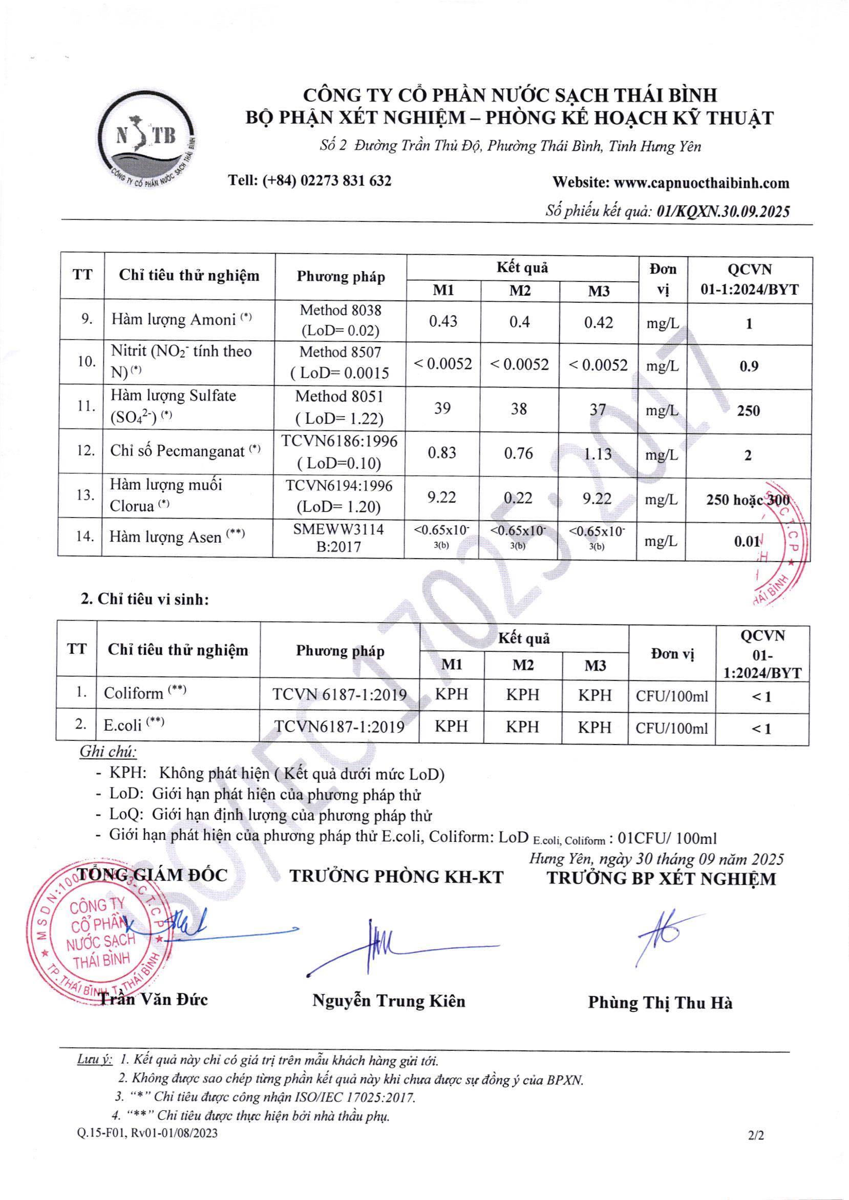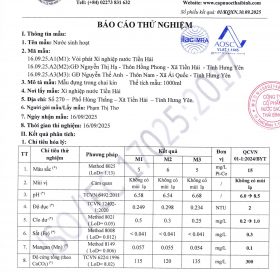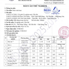 Kết quả kiểm nghiệm chất lượng nước XNN Tiền Hải Quý III-2025