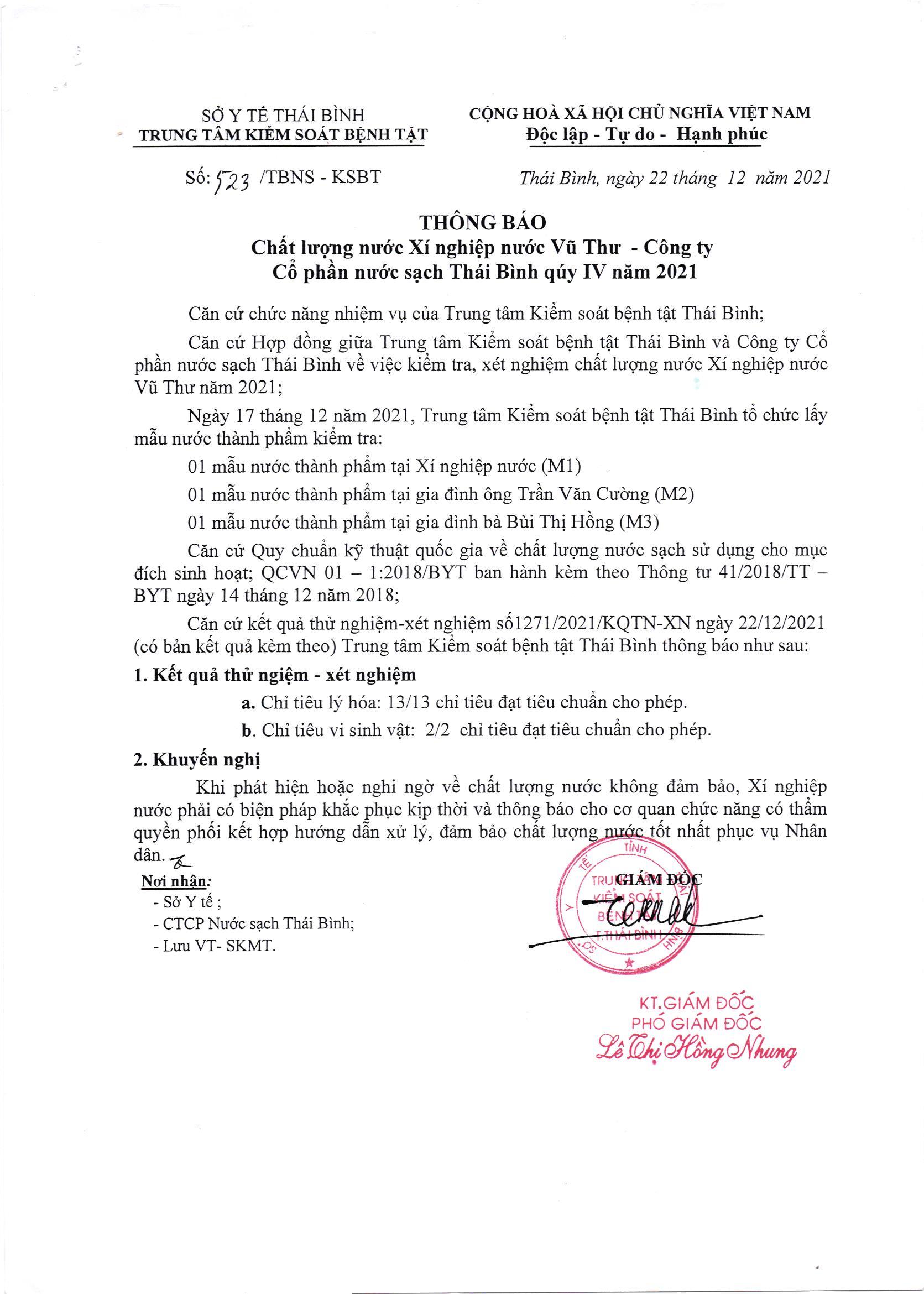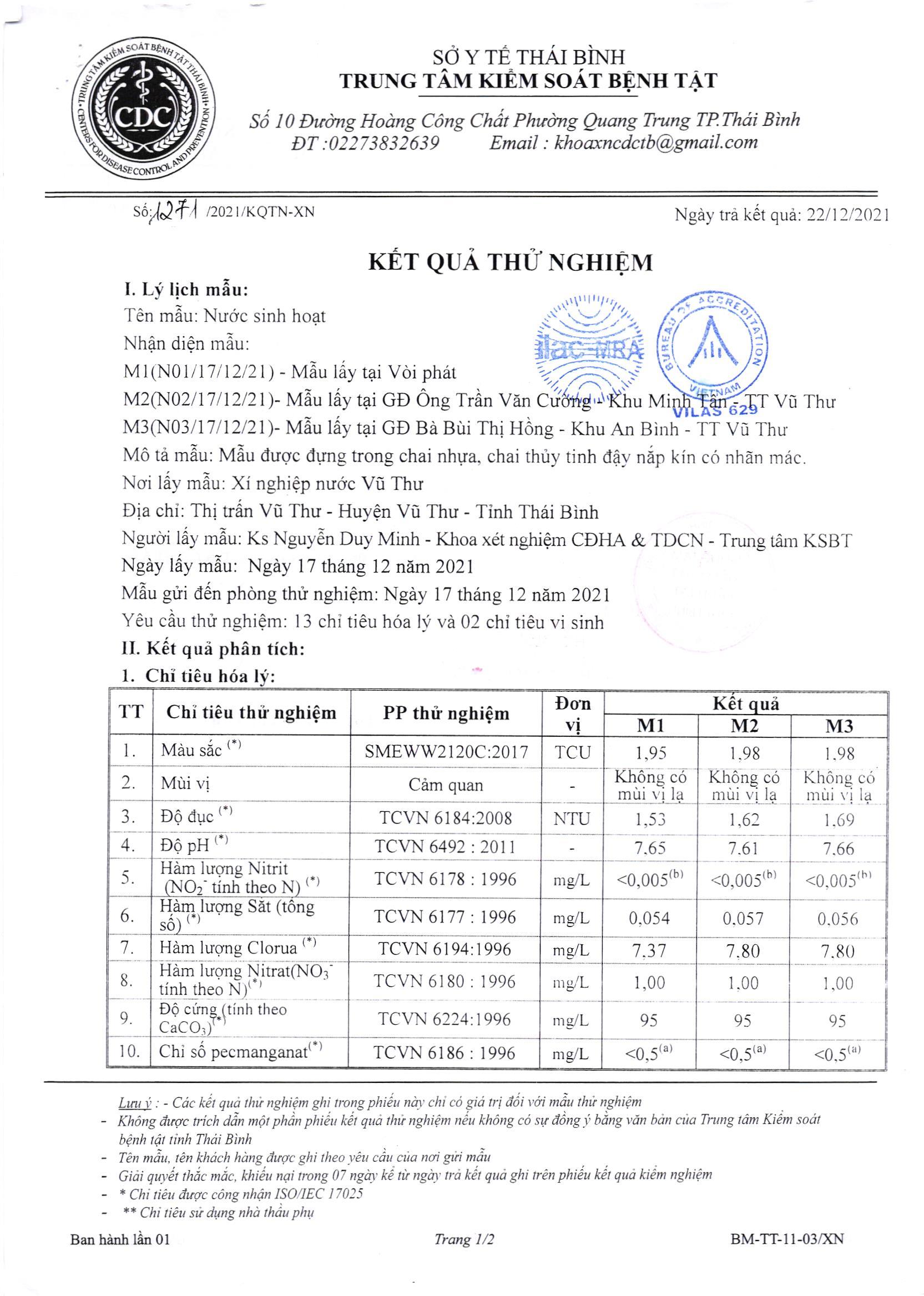 3. Xí nghiệp nước Vũ ThưKết quả kiểm nghiệm chất lượng nước XNN Vũ Thư Quý IV/2021 Posted on 13 Tháng Tư, 202213 Tháng Tư, 2022 by admin Kết quả kiểm nghiệm chất lượng nước Xí nghiệp nước Vũ Thư – Công ty Cổ phần nước sạch Thái Bình Quý IV/2021 Kết quả kiểm nghiệm chất lượng nước XNN An Bài Quý IV/2021 Kết quả kiểm nghiệm chất lượng nước XNN Thành Phố T11/2021